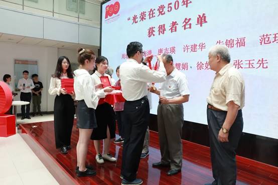 首先是“光荣在党50年”党员表彰,环境学院共有11名老党员荣获此荣誉,党委书记柳剑雄为周增炎,彭海清等7位到场老党员颁发了“光荣在党50年”纪念章,以此褒奖他们为党和国家事业长期奋斗所作的奉献。