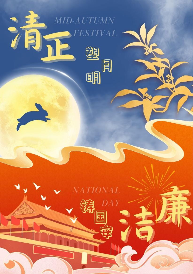 作品简介:这张海报里的意象有代表中秋节的月亮与桂枝和代表国庆节的天安门,分为上下两部分。上半部分展示了中秋节的特色,如月亮、玉兔、桂枝等,寓意团圆和祥和。下半部分展示了国庆节的特色,如天安门、和平鸽等,寓意繁荣和强大。海报的中间的“廉”字突出了海报倡导清正廉洁风气的主题。同时文字“清正塑月明,廉洁铸国安”也是暗示清正廉洁的风气有助于塑造良好的社会环境并助力国家安定。