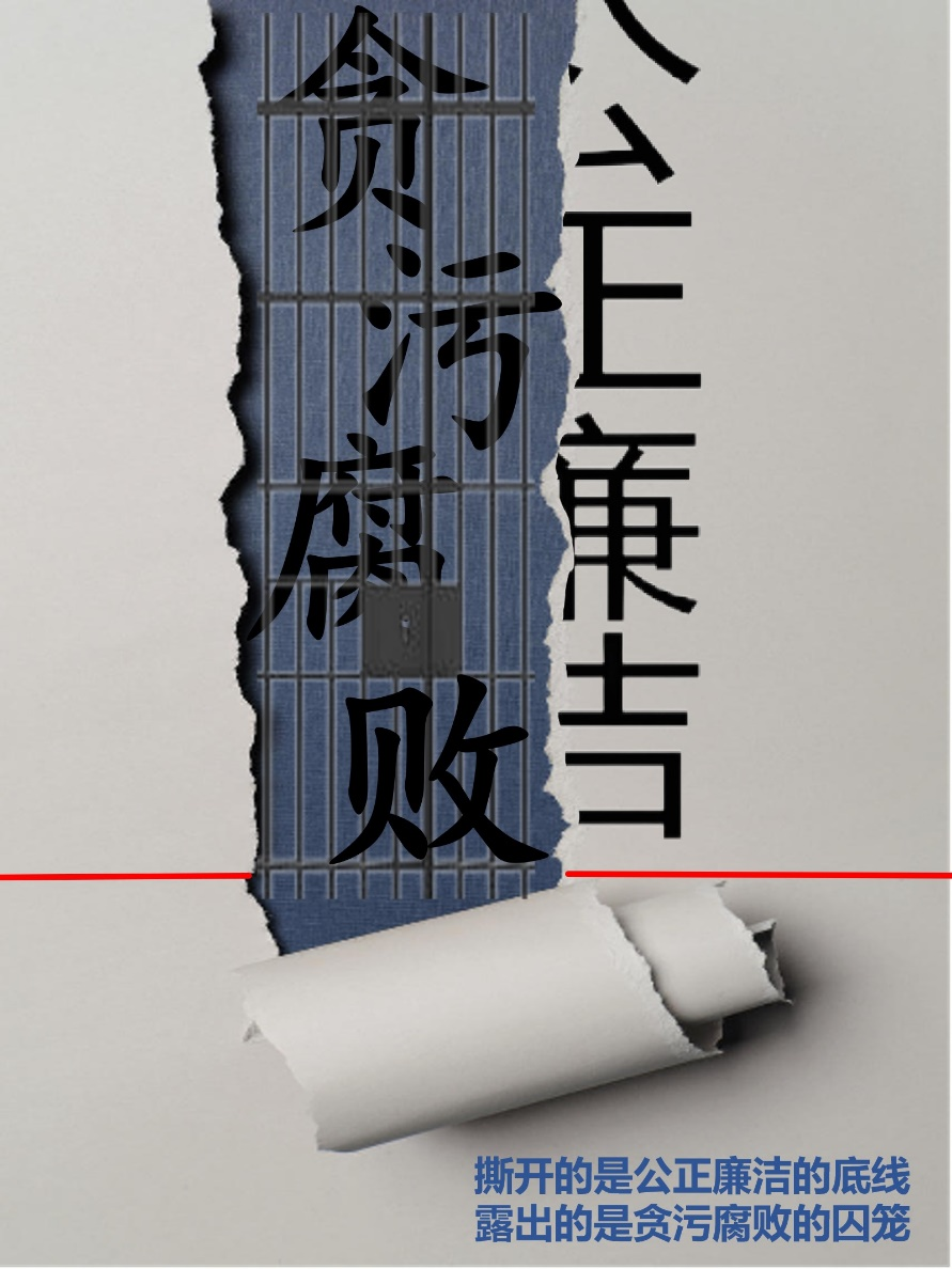 作品简介:电子海报以一张被撕开的纸为背景,原本写着"公正廉洁"四个字的纸面被撕破,同时,一条红线也被撕断,象征着公正廉洁的底线遭到侵犯。在撕开的纸下方,呈现出一个囚笼,内有"贪污腐败"四个字,寓意着当人们无法坚守公正廉洁的底线,选择了贪污腐败的道路,最终将不可避免地面临法律的制裁,陷入囚笼。作品警醒人们,始终坚守初心,纤毫物欲不相浸,清清白白做人,干干净净做事。