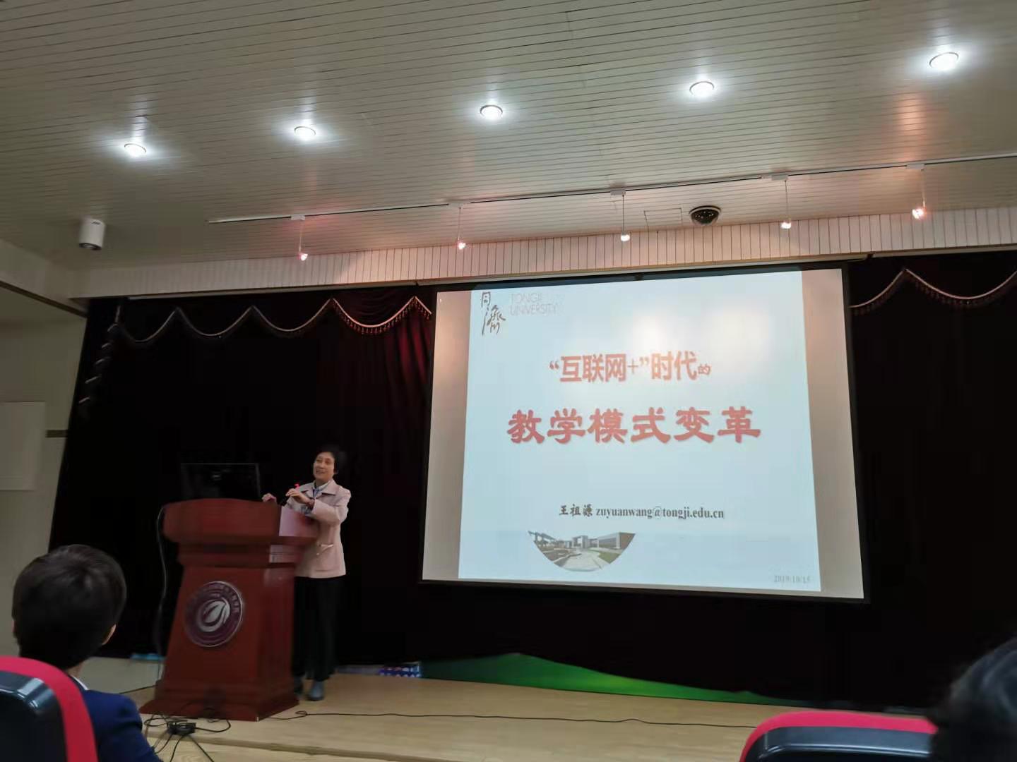 王祖源老师首先从在线课程的起源以及相关环境发展状况,意义阐述了互联网时代的教学模式的变革。她以早年的电化教学、MOOC、SPOC和翻转课堂的发展沿革到以学生为中心的教学改革历程为主线,介绍了新的时代背景下教学改革的必然性。王祖源还介绍了同济大学《大学物理》课程在新工科背景下教学改革的方法措施以及取得的成绩,并以自己授课班级在传统教学和SPOC翻转课堂教学模式下,学生的感触和成绩作为对比,认为通过混合式教学激发学生的探索求知能力是较好的教学方法。主题报告会后,王祖源教授与学院老师进行了深入交流,探讨了在线教学与课堂教学的差异和共同点,并介绍了在线教育的情况。