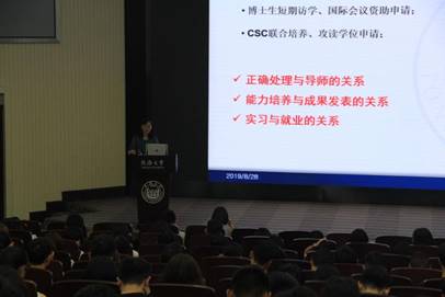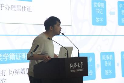 随后,由学工办老师为研究生作新生入学培训。辅导员黄圣洁、徐畅、冯天磊老师分别围绕研究生奖助体系、出国出境渠道与学籍办理流程三个部分的内容进行介绍。这三个部分的内容与研究生生活息息相关,奖助体系列举了研究生期间国家和学校、导师对于同学们在求学生涯的经济支持,出国出境渠道为同学们的深造提供了机会,学籍办理流程对于同学们办理相关事务提供保障。