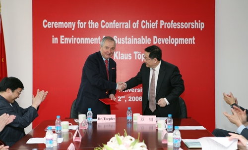2002年,时任联合国副秘书长、联合国环境署执行主任的托普弗与时任同济大学校长吴启迪签署了双方共同成立联合国环境署-同济大学环境与可持续发展学院(IESD)的协议。17年来,托普弗博士一直指导和关心学院工作和与同济大学的合作,获得中国国家国际合作奖、中国政府“友谊奖”和上海市白玉兰奖,并在同济大学设立托普弗环境奖学金。