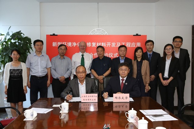 2019年9月26日,我院与上海复洁环保科技股份有限公司签订“新型环境净化与修复材料开发及工程应用”产学研合作协议。同济大学常务副校长伍江教授、联合国环境规划署国际环境技术中心主任Keith Alverson博士、同济大学环境学院院长戴晓虎教授、同济大学工程与产业研究院院长张亚雷教授、学院副院长李风亭教授、张冰如教授,上海复洁环保科技股份有限公司黄文俊董事长、许太明副总经理等高管团队成员出席了签约仪式。双方就进一步加强环境净化与修复材料领域的产学研用合作深入交换了意见,达成了广泛共识。