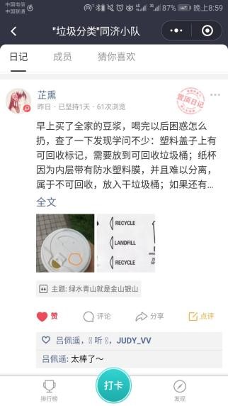 在活动中,同学们利用小程序建立圈子“垃圾分类同济大学小队”,持续发布有关垃圾分类和生态保护的“闯关主题”和“每日主题”,同学们每天在小程序上打卡发布日记,分享自己每天为垃圾分类或环保做的小事。另外还建立微信群作为打卡小程序的补充,用来发布有关活动的各类信息。同时同学们可以在微信群中相互交流感受,解答在垃圾分类的具体行动中遇到的问题,分享有关垃圾分类的最新资讯等。
