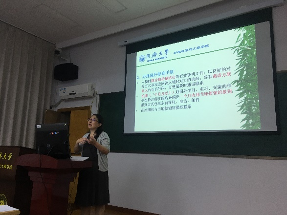 钱老师向即将出国(境)的学生介绍了同济大学、环境科学与工程学院公派出国(境)相关规定。钱老师介绍:离境前必须先在学校出国系统中按要求进行申请,接受学校学院组织的相关行前教育。同时,鼓励出国(境)学习、实习、交流的学生通过交流学习不断提高能力,充实自己等。另外,强调各位同学要保证身体健康及出行安全。在圆满完成出访任务后,应按计划按期回国,并在回国后的一周内向所在学院报到,及时办理相关手续。回校后,学生应与学院同学进行交流与分享。此外,徐畅老师向大家介绍更新的出国(境)流程,详细说明回国报道步骤,方便大家办理。
