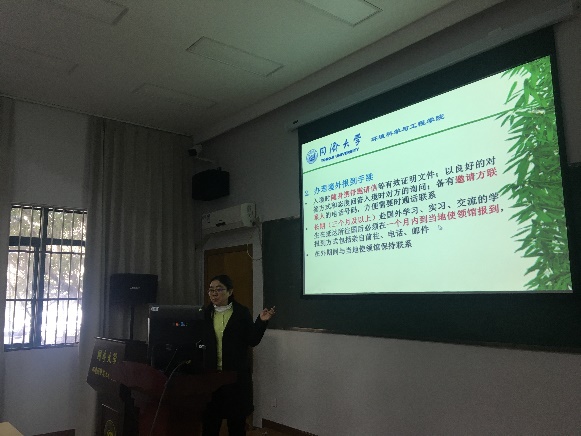 钱老师向即将出国(境)的学生介绍了同济大学、环境科学与工程学院公派出国(境)相关规定。钱老师介绍:离境前必须先在学校出国系统中按要求进行申请,接受学校学院组织的相关行前教育。同时,鼓励出国(境)学习、实习、交流的学生通过交流学习不断提高能力,充实自己等。另外,强调各位同学要保证身体健康及出行安全。在圆满完成出访任务后,应按计划按期回国,并在回国后的一周内向所在学院报到,及时办理相关手续。回校后,学生应与学院同学进行交流与分享。