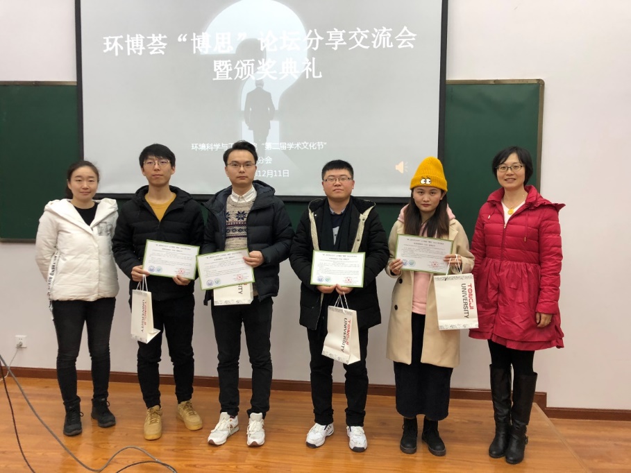 12月11日,环境学院于明净楼114报告厅举行“博思”论坛分享交流会暨优秀讲座报告颁奖典礼。环境学院党委副书记钱昕老师,环境学院研究生会学术指导教师、环境学院党委副书记、纪委书记黄清辉老师,18级博士班班主任郭美婷老师、王嘉莹老师及学院部分研究生参加活动。活动由环境学院研究生会博分会与18级博士班共同承办。