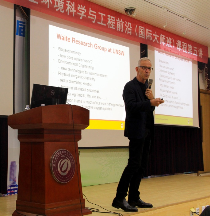 11月28日下午,环境科学与工程前沿(国际大师班)课程第五讲暨同济环境高等讲堂第13讲在同济大学环境学院明净楼121顺利开讲。本次主讲人是Trevor David Waite教授,以Recent developments in understanding of redox processes in natural and engineered systems为主题,讲解了氧化还原过程支撑着天然水生系统的许多转变,列举了他在悉尼新南威尔士大学研究小组的最新进展并进行讲解。