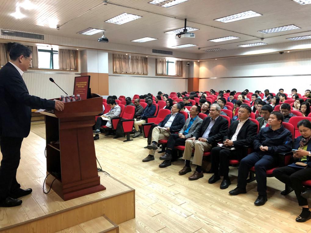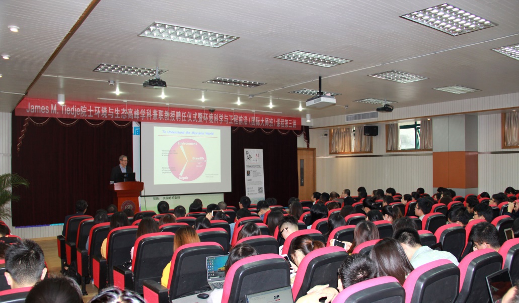 James M. Tiedje院士作为主讲人以“宏基因组学:微生物群的遗传基础”为题目,讲述了元基因组学及其衍生物微生物体已成为新时代微生物生态学的核心,并列举了生物燃料作物的土壤及其根际微生物和了解环境中抗菌素抗性基因的生态学两个例子来说明。前来听讲座的博士研究生、硕士研究生以及国际学生高达150余人,报告厅座无虚席。结束时师生们还进行了积极提问和探讨。