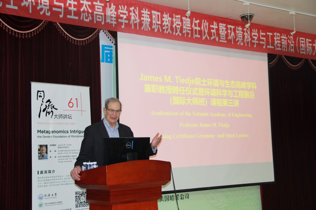 同济大学伍江常务副校长出席并强调,同济大学环境学院在培养学生和学者、发展新技术、改进基础研究、最终克服环境污染等方面,进行了大量的国际合作。此次邀请的James M. Tiedje院士是密歇根州立大学的杰出教授,他在微生物学方面做出了重大的国际贡献,是世界著名的生态学和微生物学领域的科学家。期待同济大学和密歇根州立大学之间更多的合作交流。讲座由同济大学环境科学与工程学院、长江重点实验室主任尹大强教授主持,环境科学与工程学院副院长、IESD(联合国环境规划署—同济大学环境与可持续发展学院)常务副院长李风亭教授、环境科学与工程学院副院长徐斌教授、环境科学与工程学院环境工程系主任李咏梅教授、盛光瑶教授和楚文海教授等教师受邀参加。