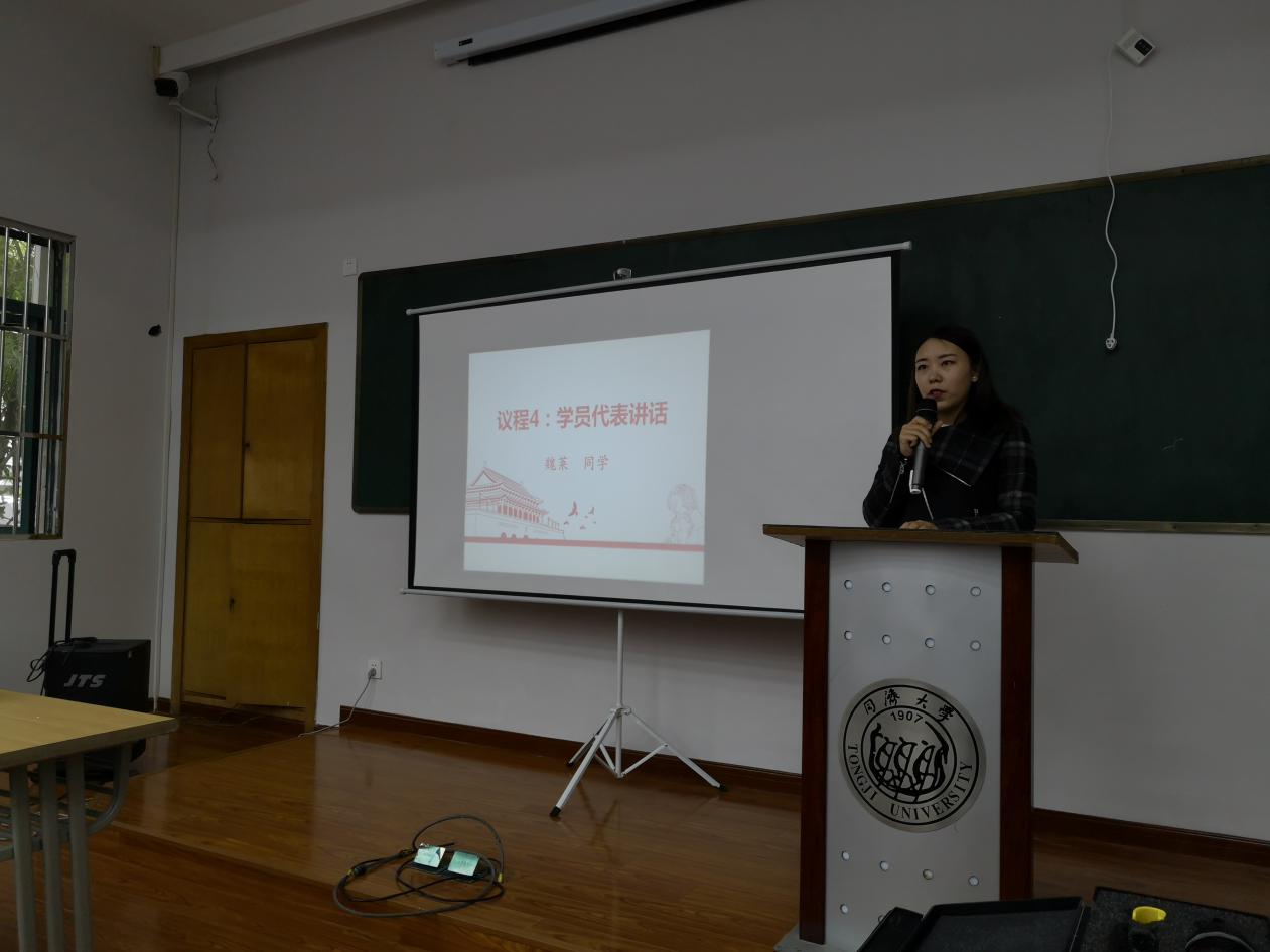 之后,来自环境科学与工程学院的魏莱同学作为学员代表发言,她在发言中阐述了自己对党的认识,也表明了此次参加党校培训的态度和决心,代表所有学员感谢学院党委和学生党组织给所有学员们提供进一步深入了解党、认识党的学习机会,他们定当好好学习,努力成为习近平总书记提出的“有理想、有追求、有担当、有作为、有品质、有修养”的德智体美劳全面发展的当代优秀大学生,做到有所收获、有所成长、有所提高。