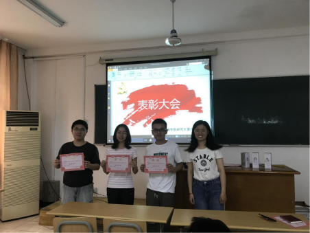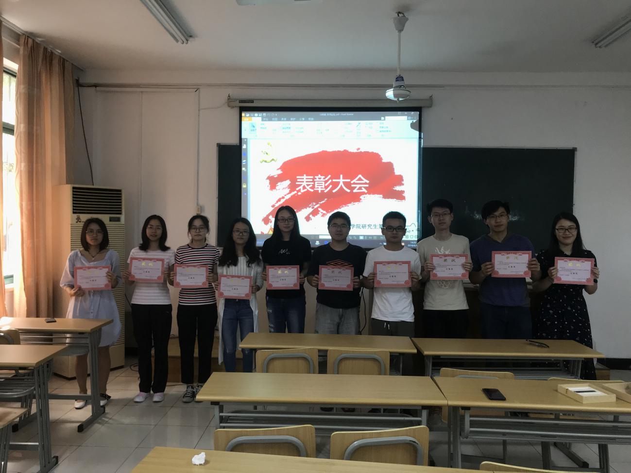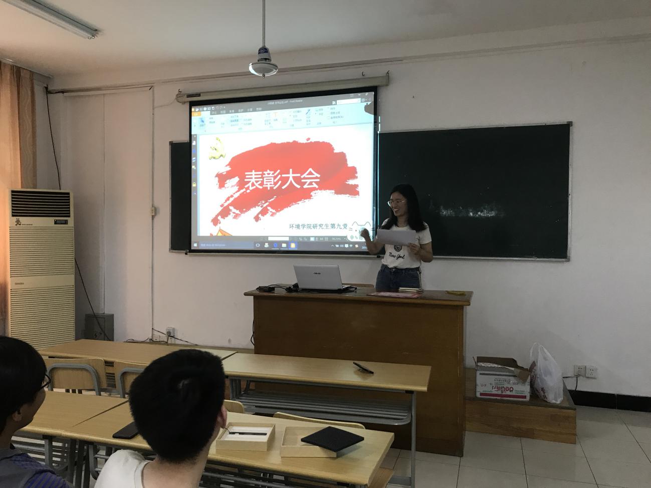 2018年7月30日中午12:30,中共同济大学环境科学与工程学院研究生第九党支部党员同志在环境学院明净楼109教室召开2017-2018年度党内表彰大会。本次大会主要表彰在2017-2018年研究生第九党支部表现优秀的党员同志。其中,吴璇、马占芳、董林凡、张迪、王启明、夏樱、谢予婕、刘倩宏、方定懿、袁亚楠、陈胜华、艾静同志获得全勤奖;陈胜华、方定懿、艾静同志获得支部优秀党员称号,三名同学一直积极发言,参加组织生活,党性较好。本次活动给党员同志发放奖状及奖品以资鼓励,充分调动了党员同志的积极性,希望大家再接再厉。