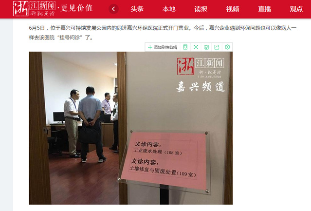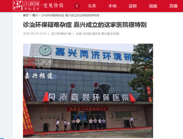 其中,浙江日报旗下的浙江新闻客户端,以《诊治环保疑难杂症嘉兴成立的这家医院很特别》为题对同济嘉兴环保医院的开业盛况、专家义诊情况、环保医院运行模式、环保医院成立的背景以及意义等作了深入而详细的报道。