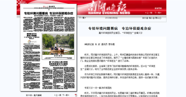 南湖晚报以《专给环境问题看病专治环保疑难杂症》为题,头版报道同济嘉兴环保医院开业盛况。
