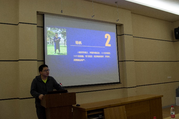 然后是马冬冬师兄,他是伊可净环境科技有限公司创始人。他结合自己的创业经历,分享了他的创业初衷和创业路上遇到的困难及感悟,并针对同学们的提问进行解答。