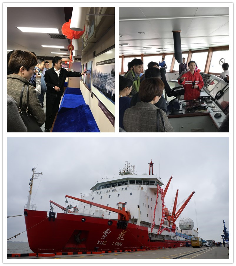 党员师生一行到达码头后,立刻被眼前这个长达167米、宽22.6米的闪耀着红色光辉的“雪龙”所吸引了。在海风呼啸中,大家步行艰难,而雪龙号则稳稳地停靠在码头,似乎在向来访者展示它不惧风浪、破冰前行的自信和坚韧。在中国极地研究中心船舶与飞机管理处处长、中国31次南极科学考察队南极长城站站长徐宁的带领下,师生们带着好奇和敬畏,迎着海风登上雪龙号,开始参观学习活动。徐宁处长首先带领大家参观了“中国极地考察30周年图片展”,结合历史照片向党员师生们生动讲解了我国极地考察30多年来的发展历程和重要成果。通过图片展大家还了解到,习近平总书记在2014年视察雪龙号时提出中国愿与国际社会一道“更好地认识南极、保护南极、利用南极”,诠释了南极科考的新时代价值,这极大鼓舞了极地科考人员为建设海洋强国而继续奋斗。
