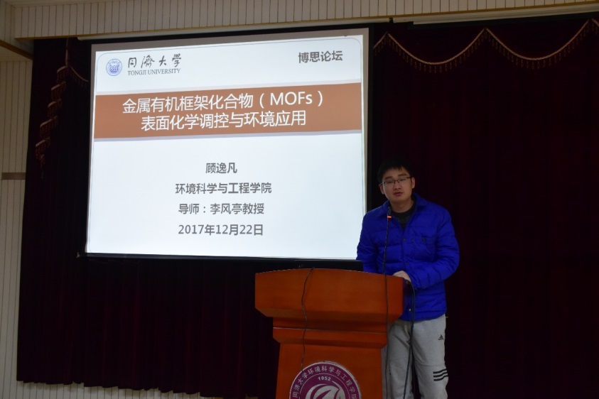 环境学院博士顾逸凡报告围绕金属有机框架化合物(MOFs)突破的环境性能展开,详细介绍了通过调节配位过程进行MOFs材料表面修饰、MOFs材料合成后表面修饰、共价改性以及外延生长制备复合MOFs材料体系。黄清辉老师就MOFs材料的实际应用与二次污染问题与顾博士进行热烈探讨。
