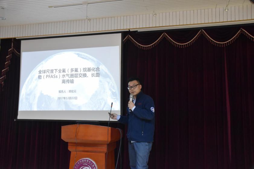 环境学院郑宏元博士则从全氟(多氟)烷基化合物(PFASs)对人体造成的健康危险以及在环境介质中和生态的分布引出,介绍了PFASs的全球尺度的浓度水平和空间分布以及PFASs的长距离传输机制。并就冯雷雨老师提出的长距离传输中大气传输和表面微流哪个的影响更大,做出了合理地推断。