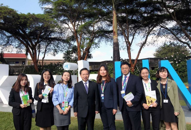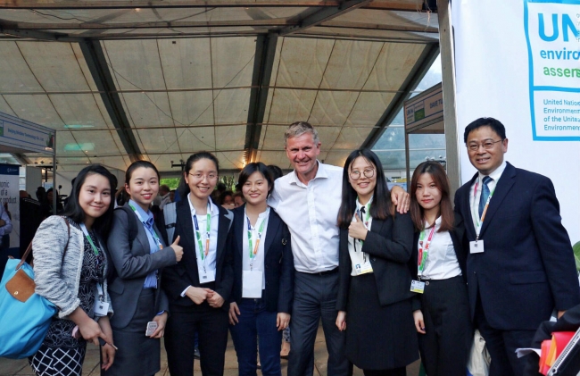 同济大学受邀在此次大会发言、展览并派出学生观察团。大会期间,同济代表团介绍了绿色校园和环境教育研究工作,充分展示了同济大学的在环保方面的贡献和影响力。联合国环境署执行主任埃里克索尔海姆和李干杰亲切问候了同济学子,鼓励青年学子关注国际前沿环保科技发展,结合专业知识,努力为世界的环境与经济可持续发展做出贡献。