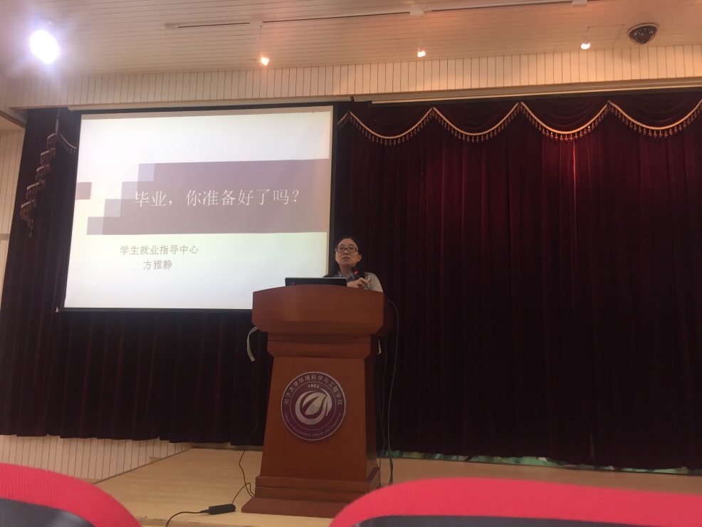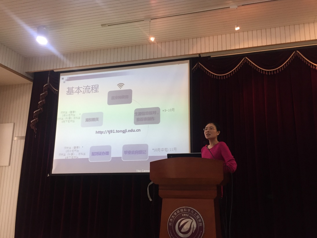 2017年10月20日中午12:30,环境科学与工程学院就业指导讲座在明净楼121报告厅举行。同济大学学生就业指导中心副主任方雅静、环境学院党委副书记钱昕、环境学院学工办就业负责老师冯天磊出席本次讲座。