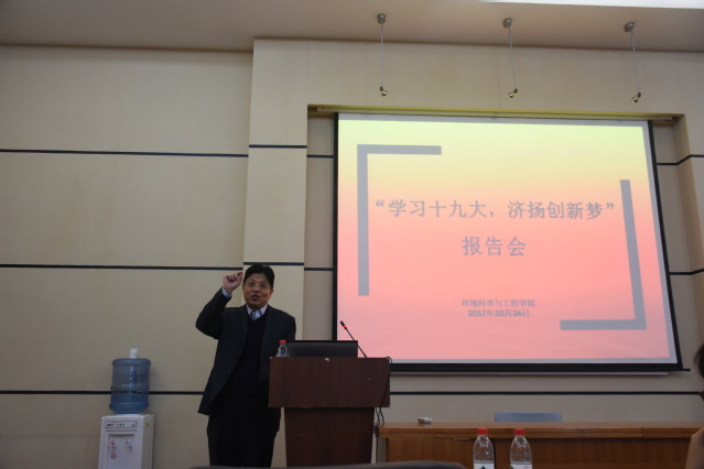 10月24日下午,环境学院“学习十九大,济扬创新梦”报告会在明净楼四楼报告厅成功召开。大会由学院团委书记王宁老师主持,学院党委副书记徐竟成老师、创新实验相关负责人刘佳老师出席。2016级创新项目负责人参加了此次会议。