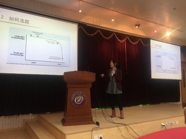 经过有趣的抽奖环节后,接下来由15级市政工程博士生肖倩带来其分享——“那年花落花开、月缺月圆”。肖倩以一个有趣的调查开场,将自身经历作为案例,讲述了自己从跟班做实验、阅读文献,到自主摸索处理实验数据、设计实验方案和课题研究方向,再到最后获得各项优秀研究成果的过程,提出了有效撰写文章的方法。15级市政工程研究生袁蓁的分享主题为“我选择的路”,从学习科研、社会工作及建议三个方面阐述,最后给大家的提出如何平衡科研和实习的相关建议。