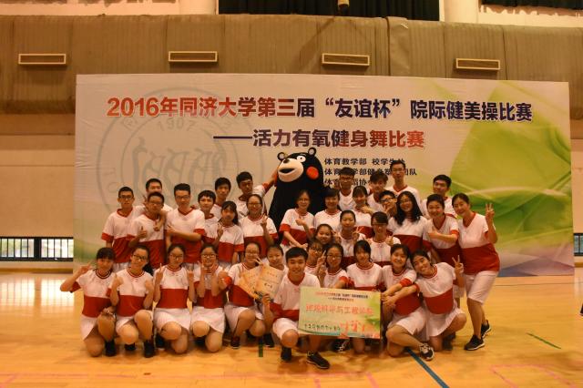 12月6日,2016年同济大学“友谊杯”院际健美操比赛在南校区体育馆举行。由我院王宁老师、蓝翊老师、赵文萍老师和33位2016级本科生组成的环境学院代表队以总分第一的好成绩荣获了大赛一等奖,同时荣获最佳活力奖。