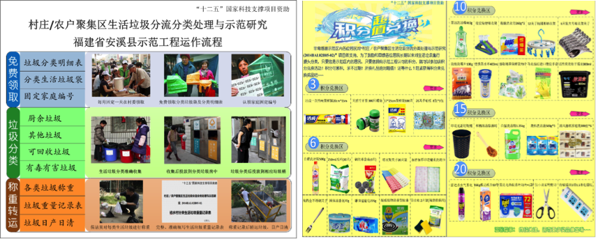 依托于“十二五”国家科技支撑计划课题“村庄/农户聚集区生活垃圾处理与资源化利用技术及工程示范研究”(2014BAL02B05),同济大学环境科学与工程学院赵由才教授课题组在2015年历经半年对全国农村生活垃圾的产生及处理处置现状做出全面调研和分析后,于2015年4月至今,在福建省泉州市安溪县选取了覆盖约1.3万常住人口的3个村镇作为示范点,在安溪县环卫处的协助下全面开展了农村生活垃圾源头分类分流与资源化处置示范工程。该示范工程开展至今已一年有余,进行基础调研、入户回访60逾次,举办相关宣传讲座、教育培训以及组织相关会议15次以上,参与群众300人以上,得到了当地居民和村委干部的大力支持。