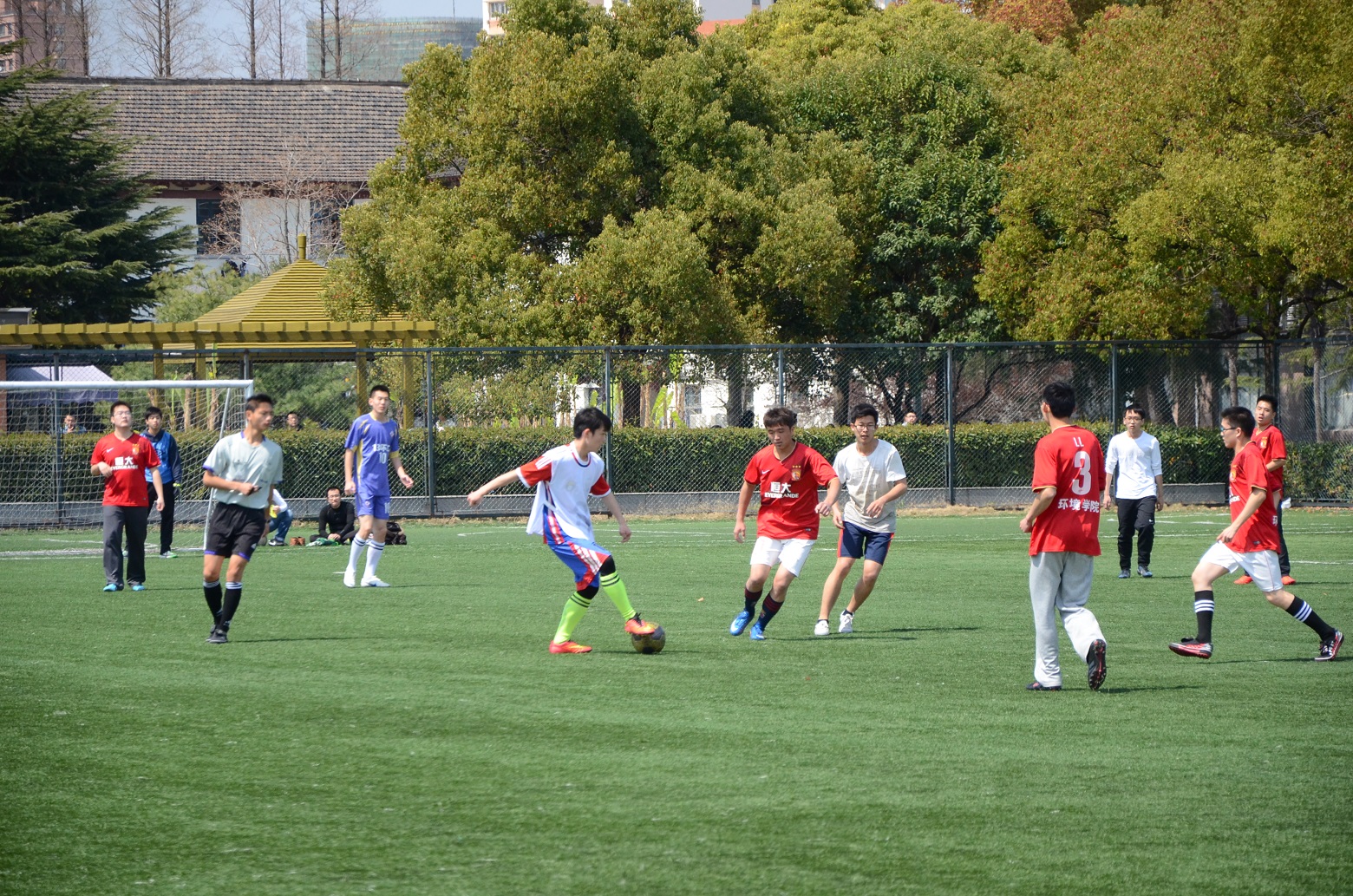 本次足球赛采用小组赛积分的赛制决出四强并争夺冠军,包括各年级本科生和研究生在内的共10支队伍参与了本次比赛的角逐。比赛中,各年级的参赛队伍均展现出不俗的实力和各自的风格。大一、大二的队伍虽组建不久,缺少经验与队友间的磨合,但球员们斗志如虹,在场上敢拼敢抢,攻防积极,不少球员更是在比赛中崭露头角,展现了出色的个人实力;大三、大四及研究生各队伍则不仅经验丰富,意识成熟,更在身体素质和心态上占据着优势,球风稳健。各场比赛均异常激烈,给观众留下了深刻印象。