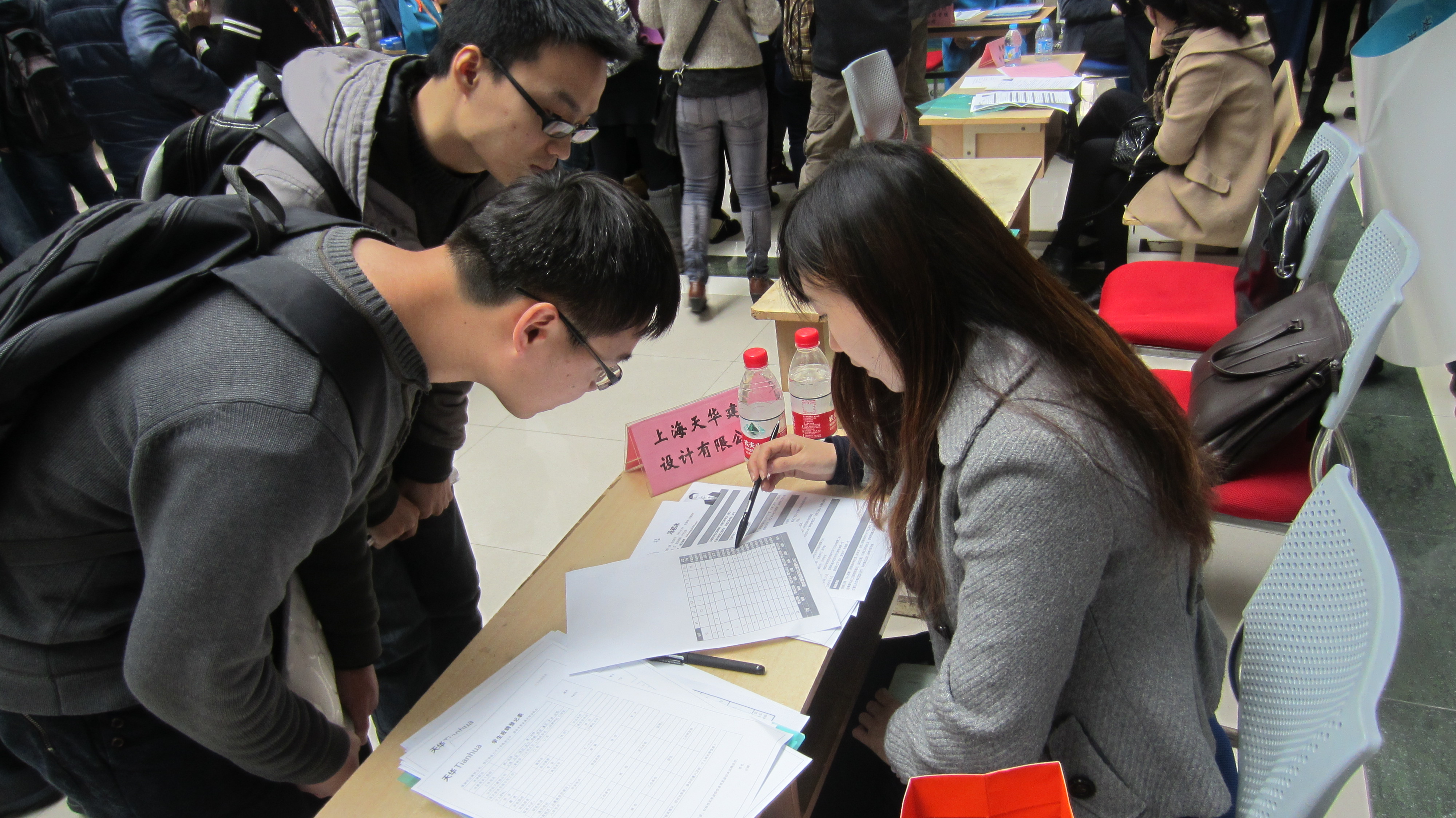 招聘会当天,学生们便早早地到场,比照着单位名单甄选自己所感兴趣的职位。不多时,环境学院大厅已人声鼎沸、热闹非凡。学生们有序地排起了长队,自信而礼貌地向企业推荐着自己,并通过与招聘专员的交流,了解公司情况、工作要求、职业规划等方面内容。有的学生不仅手持简历,也穿上了一身正装以表郑重;有的学生谈吐大方,和招聘单位侃侃而谈,进行着愉快的交流;也有学生在各个单位之前徘徊,紧张而谨慎……会场上不仅有2015届毕业生,研二、大三“学弟学妹”的身影也穿梭在其中,为自己争取实习岗位,提前开始了对就业市场的“试水”,为自己一年后的就业打前站,针对就业市场开展“自我调研”。