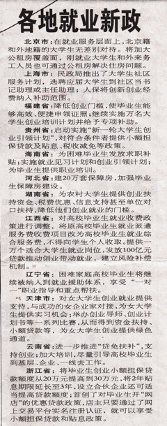 福建省:降低创业门槛,使毕业生能够高效、便捷申领证照;继续实施万名大学生创业培训计划并给予专项补助。