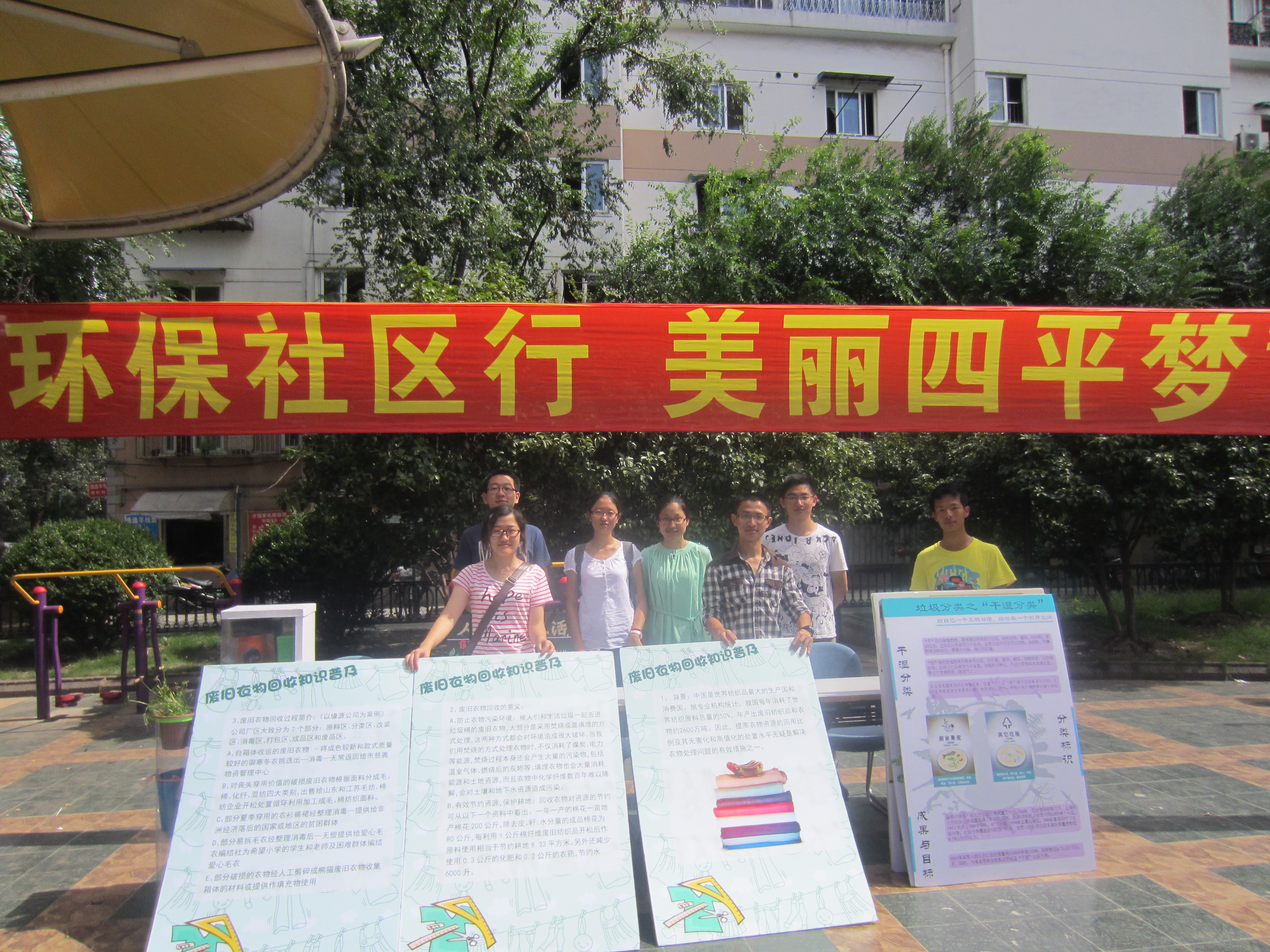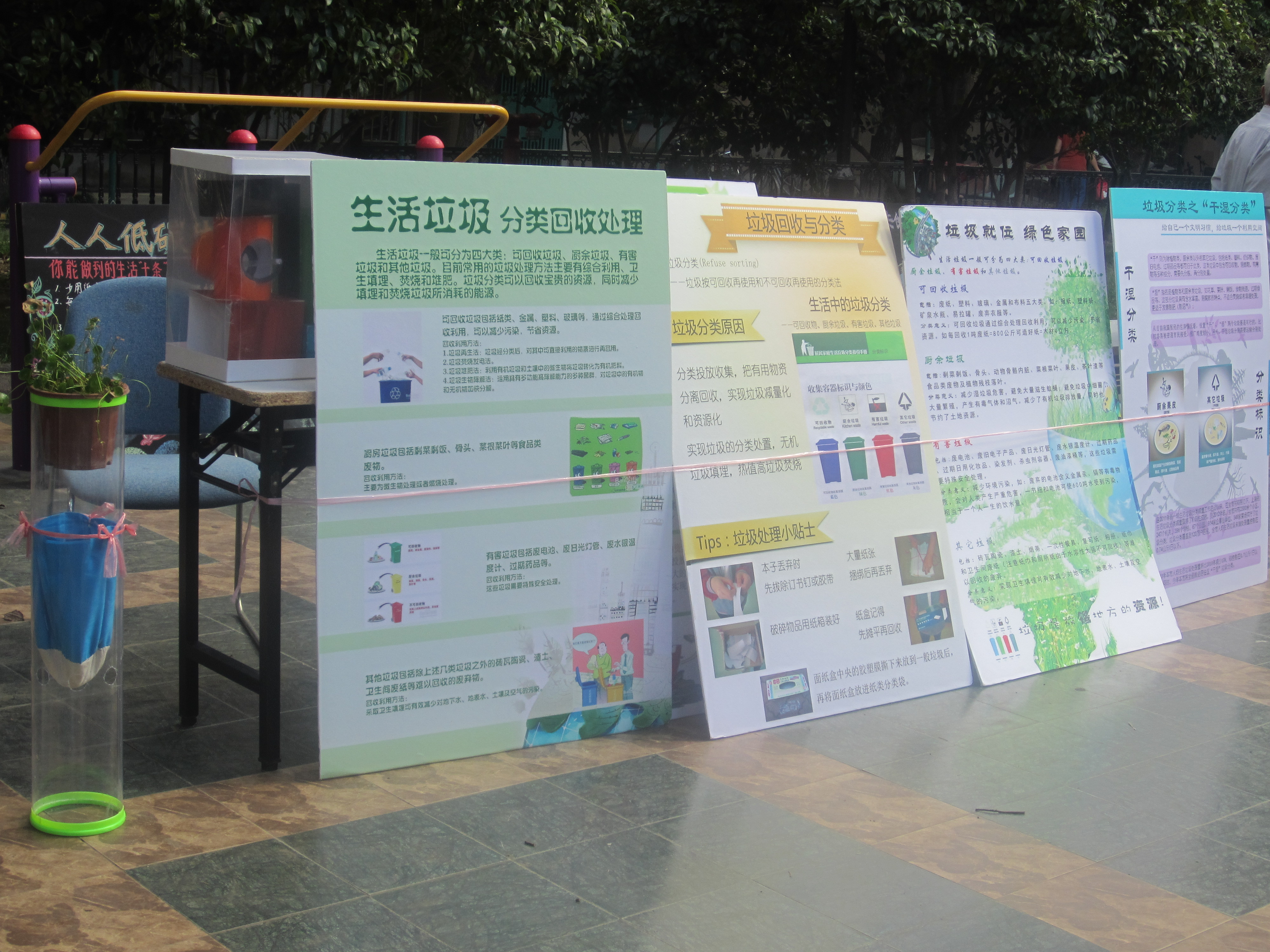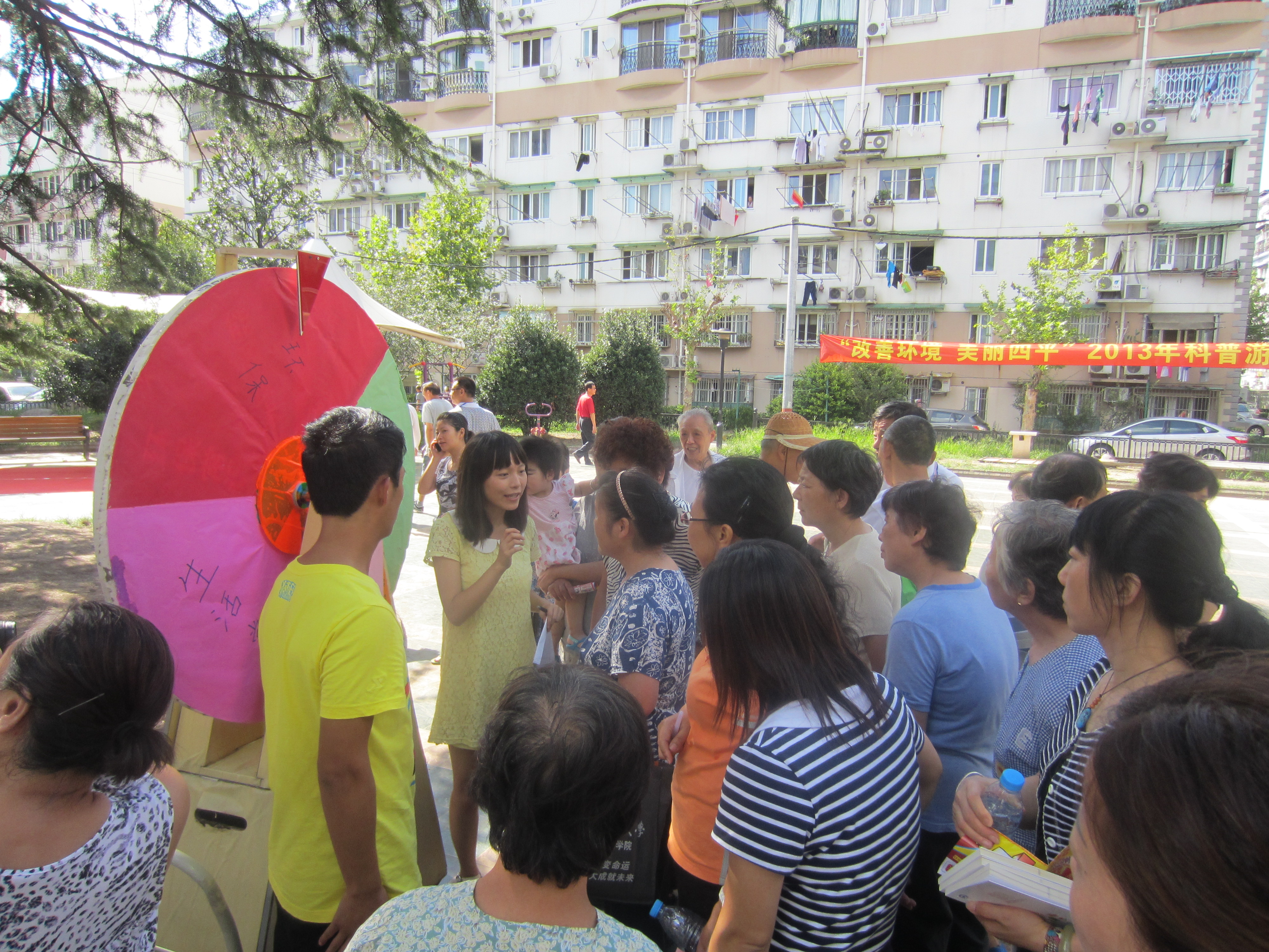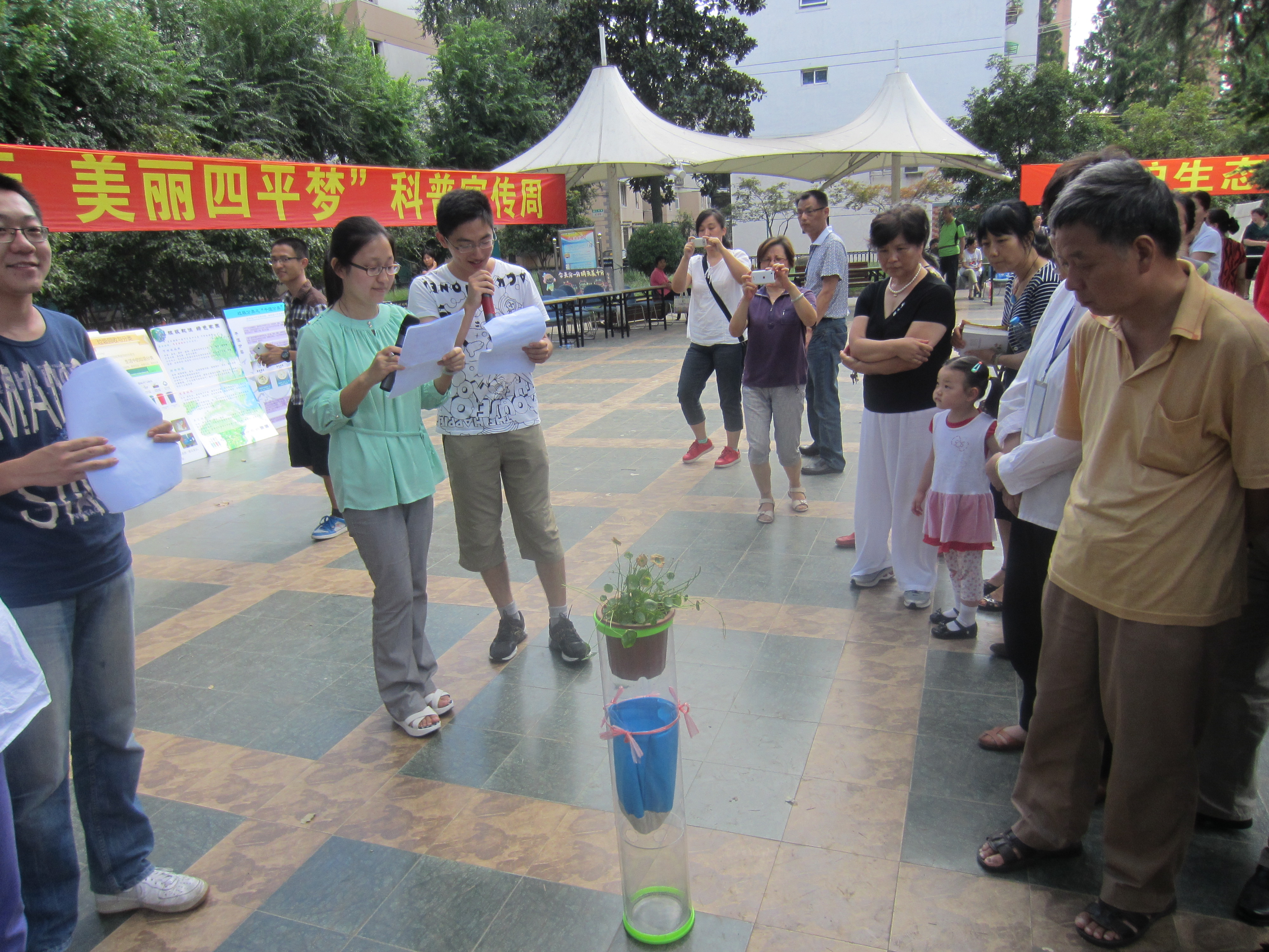 科普游园会于当日下午两点正式开始。首先由四平舞蹈队带来了环保时尚走秀和舞蹈《鸿雁》,分别体现了废物利用和人与自然和谐相处的理念。文艺节目结束后便是各单位的展示时间。针对此次游园会的主题,我院志愿部的同学们准备了三方面的展示内容。首先是环境展板的展示,精心准备了大量的科普知识展板供居民们学习,其中包括垃圾分类、节能减排、环保常识等日常生活中经常接触到的一些小知识。另外,大三的贾宝辉、张达丰、王薇梓、陆瑶等同学还为大家展示了他们的暑期社会实践成果——一个用养花水养鱼,养鱼水浇花的循环多次利用的装置。为了帮助居民们能更好地理解这台装置的用途,他们还精心编排了一段小品,幽默的表演吸引了许多市民驻足观看。除了项目展示,最后,同学们还利用四平街道为他们准备的大转盘,与居民们进行了游戏互动——有奖竞猜。居民通过转动转盘选择回答环保类、节能类、常识类等问题,若答对问题,就能获得一份实用的小奖品。活动内容丰富,奖品诱人,因此吸引了不少居民前来参加。