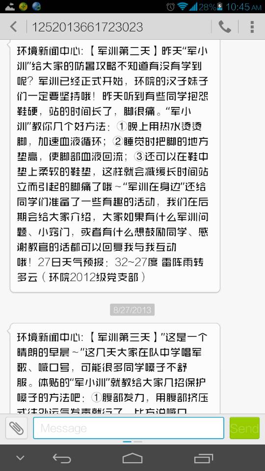 在军政训练这样一个特殊时期,党支部通过“每日飞信”为学院同学们提供防暑、防晒、减缓疲劳、天气状况等方面的小贴士,从细微处关心同学们的生活。在了解到一些同学对完成较为艰苦的军训信心不足后,党支部组织同学们相互交换“鼓励宣言”,帮助同学们树立了圆满完成军政训练的决心。