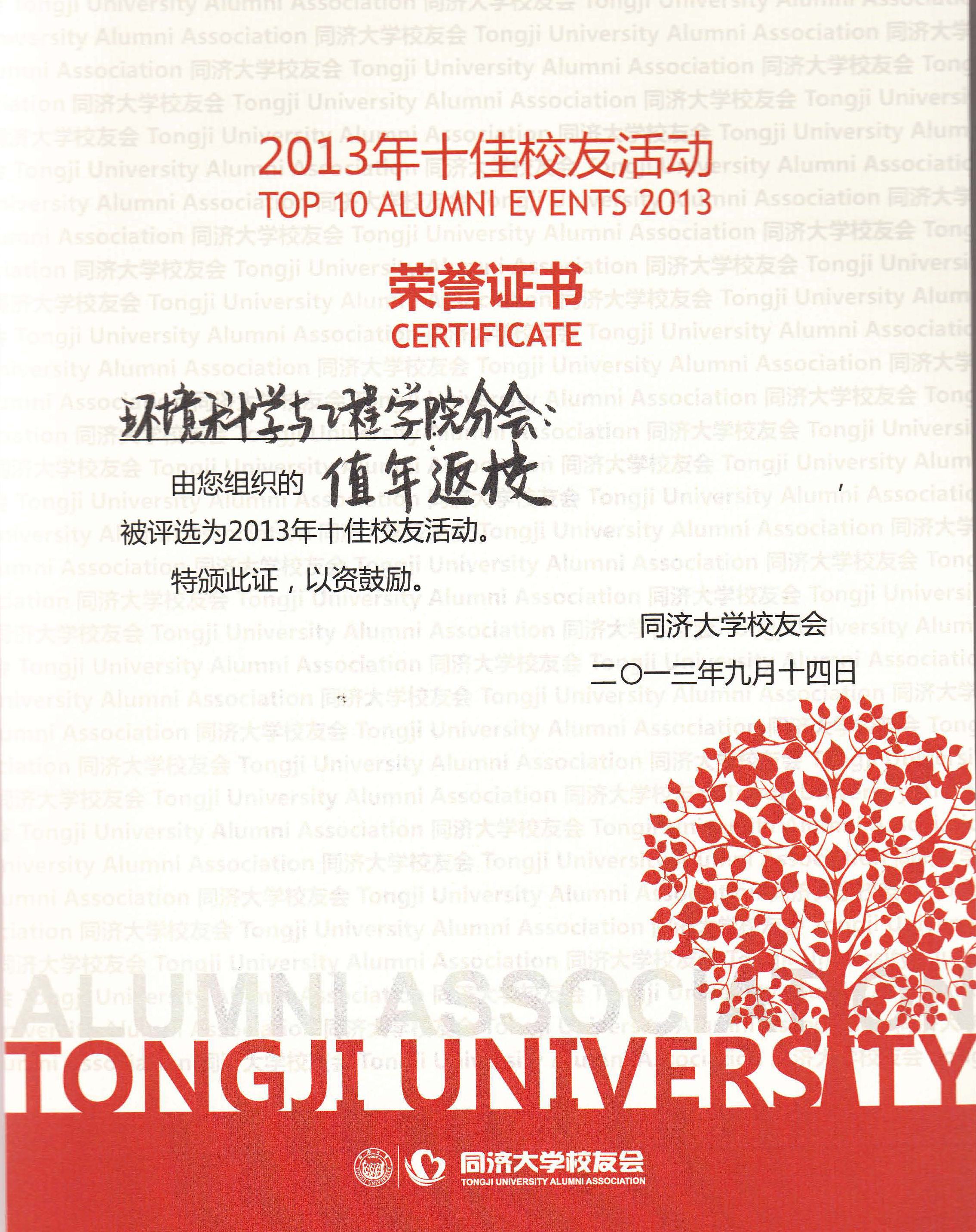 2013年9月14日“共创价值,同济天下”2013同济大学校友大会在沈阳举行。我校裴钢校长,董琦副校长与各地各行业校友会代表、学院校友分会代表参加了大会,大家凝心聚力,共促发展。会上裴钢校长为我院校友分会授旗。我院组织的2013值年返校活动荣获同济大学2013年十佳校友活动。