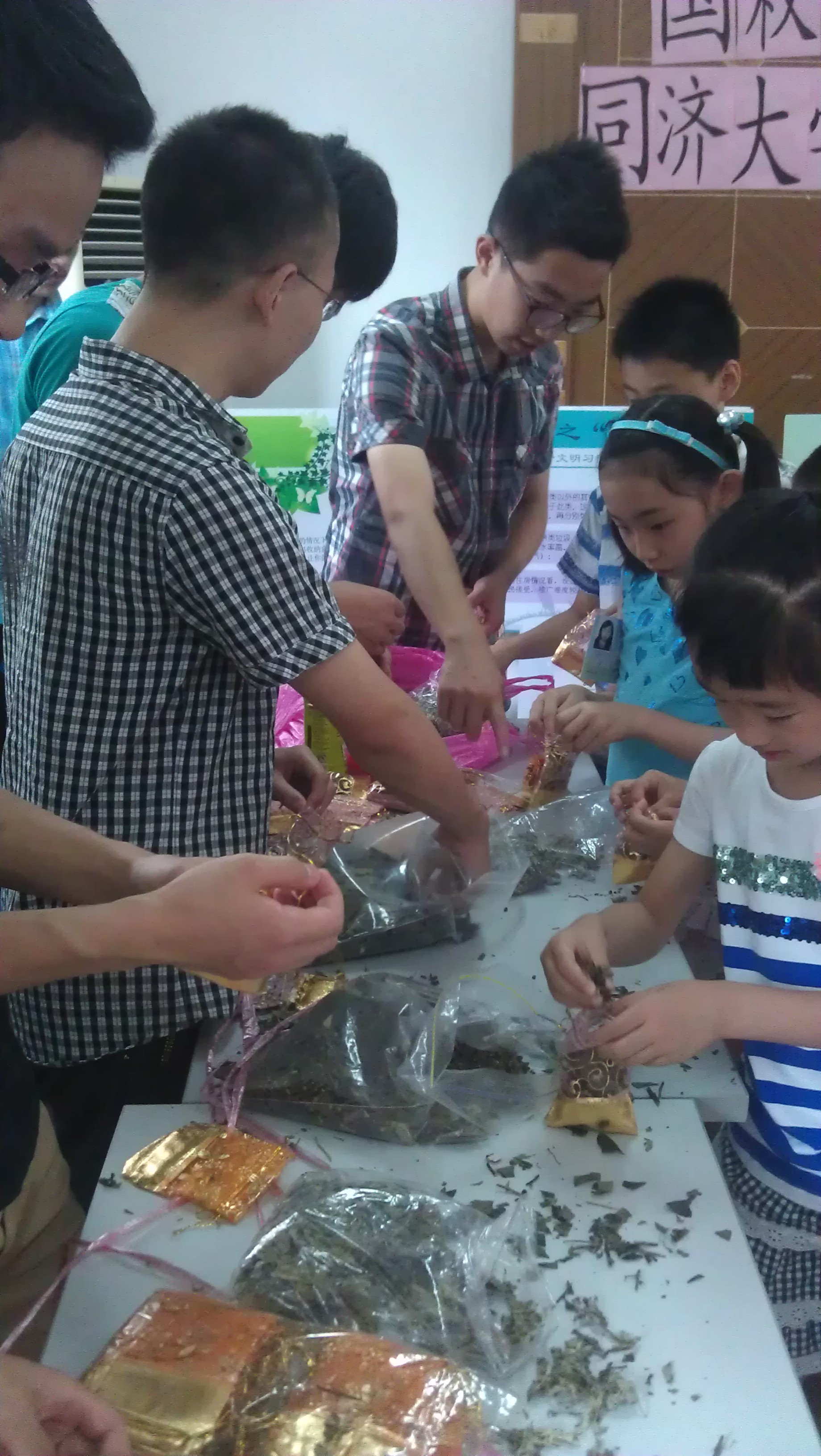 展板展示完成之后,进入互动环节。志愿者们特地为居民们准备了夏日必备的驱蚊小香囊的DIY,希望可以用这种方式减少杀虫剂的使用。我们事先准备好了DIY所需的药材和空袋,活动现场居民可以根据不同药材的功用和自己的需求来组装适合自己的小香囊。这个活动受到了居民的热烈欢迎,大家都很积极踊跃的参与到互动环节中,有些小朋友不仅做了自己的香囊,还为今天不能来参加的活动的父母也做了香囊,把环保的理念宣传开来。