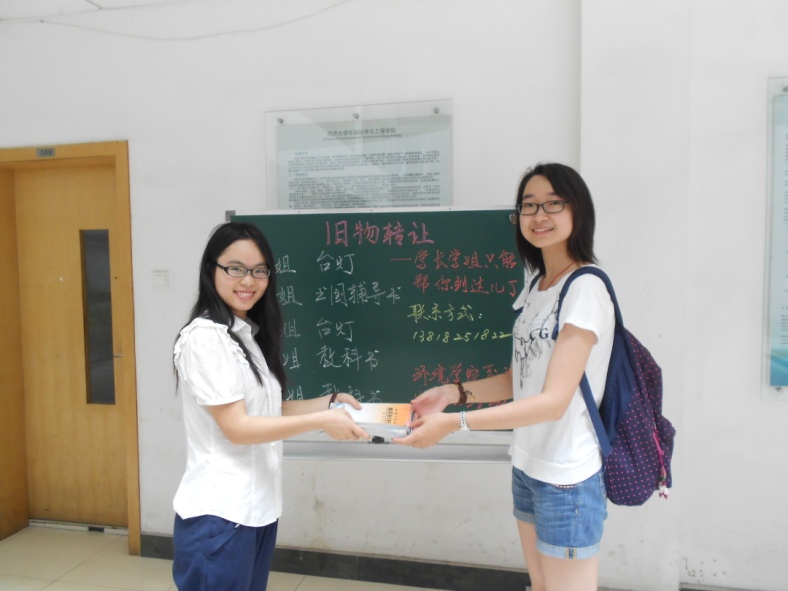 “学长、学姐只能帮你到这了”活动同样由两个小活动组成,一是旧物交换,二是心愿卡。“旧物交换”由2013届三个毕业班级共同筹备,利用已有的网上朋辈交流平台,结合学院大厅安置的黑板进行旧物信息发布。在活动的准备、开展过程中,同学们都表现出了极大的热情。学长学姐将他们用不到的但却具有实用价值的旧物留给学弟学妹们的这种活动,变“旧”为宝,也是学生们对于环境保护和可持续发展的践行。与旧物交换不同,心愿卡活动旨在鼓励学弟学妹主动发声,向学长学姐提出希望能实现的心愿,并由学长学姐帮助达成。“学长、学姐只能帮你到这了”活动加深了学长学姐与低年级同学的沟通,将环境学院团结友爱、互帮互助的传统传承了下去。