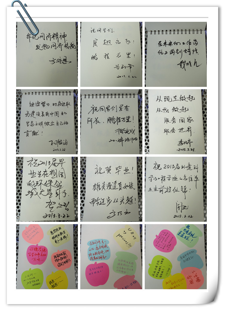 在“离别寄语”环节,学院领导纷纷给2013届毕业生写下了无尽的期望和祝福。同时毕业生们也沉浸在毕业浓浓的气氛中,写下了离别感言,最终形成了一本厚重的纪念册,将悬挂在明净楼大厅供所有环境学子观看。这本纪念册记载了离校学子对母校深深的不舍,记录了对学院满满的祝福,对学弟学妹们殷殷的期盼,更是描绘了自己远大的志向,这些都将留下来,作为学子们返校时的一种纪念。