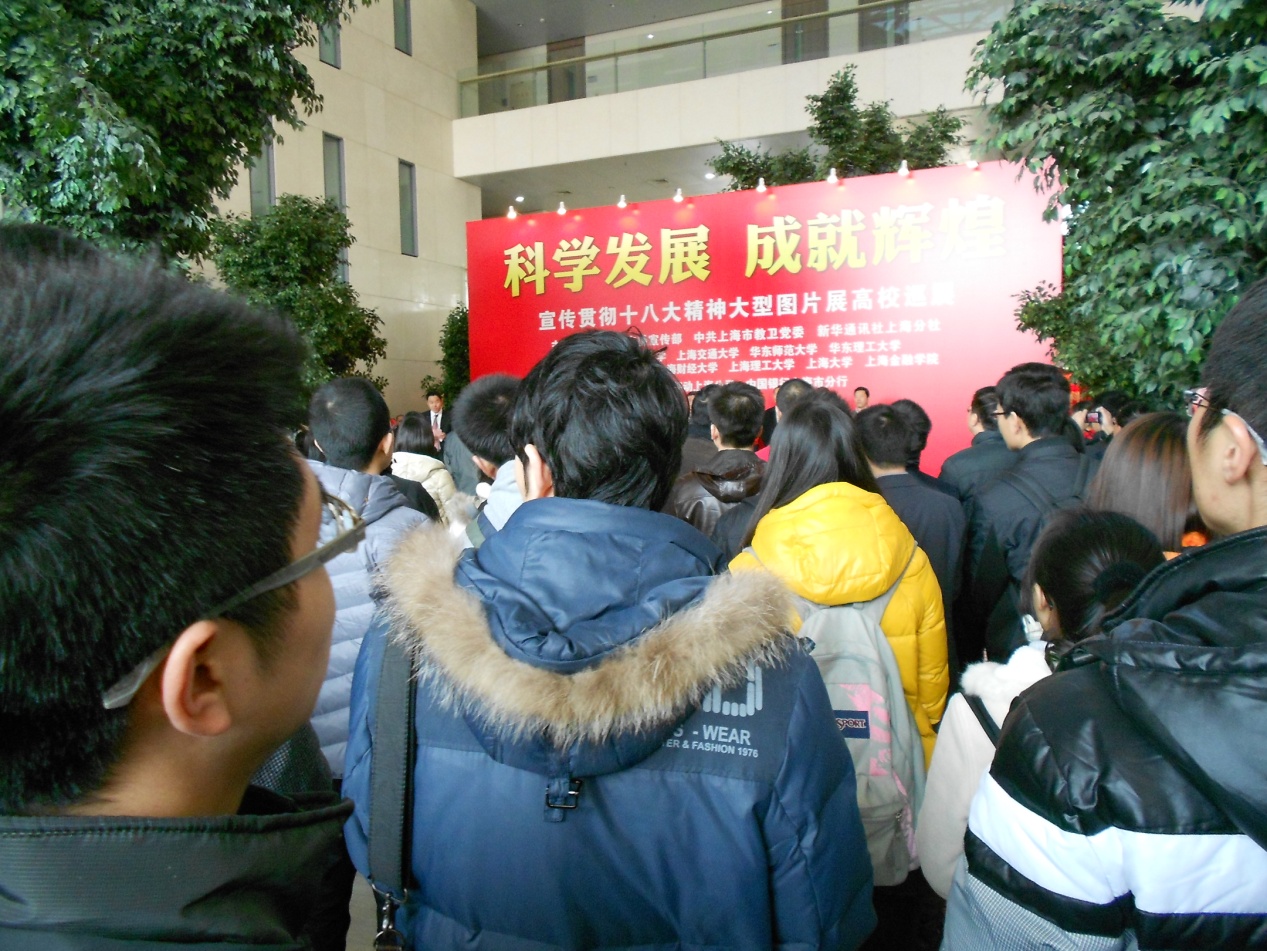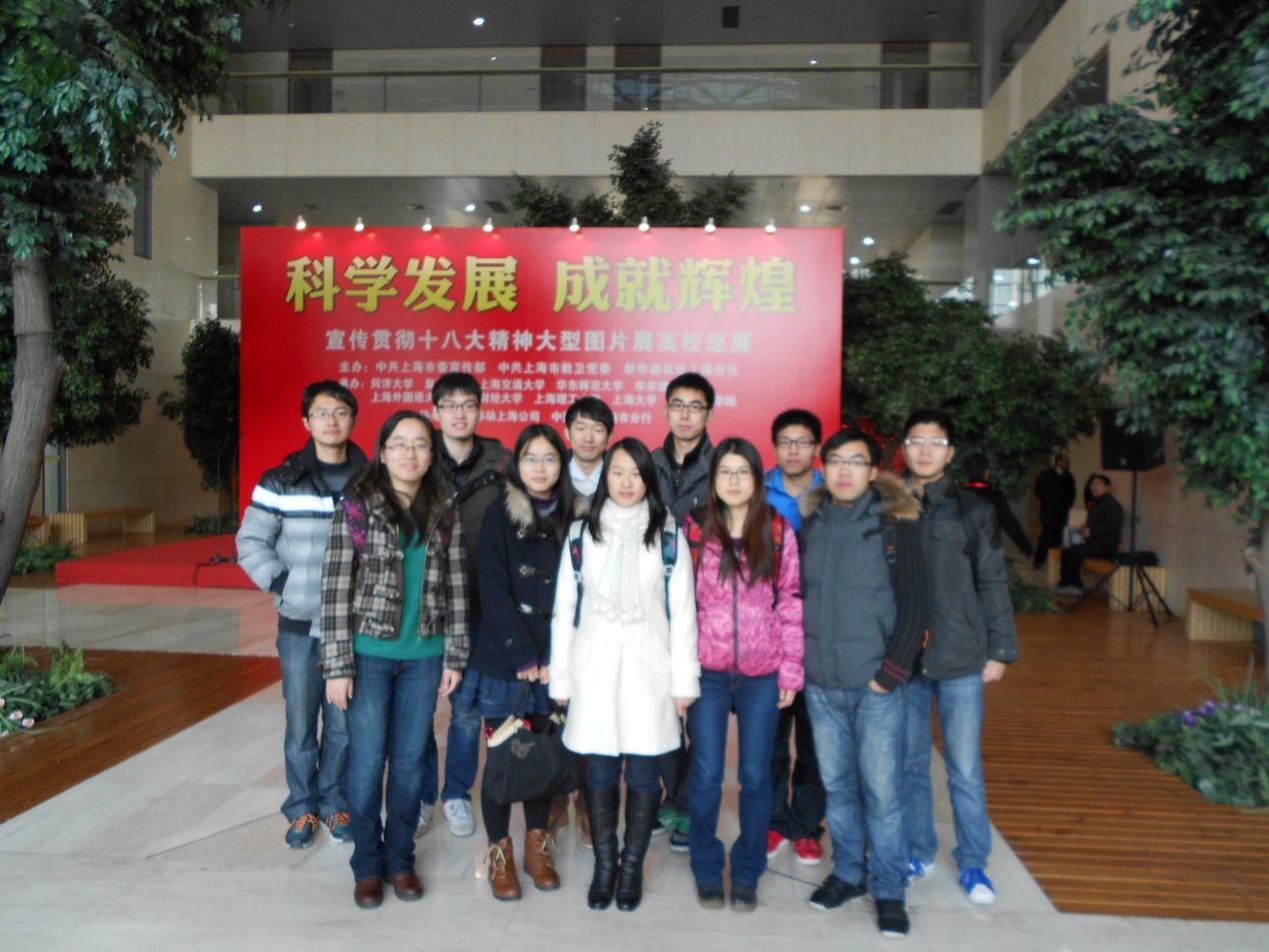 12月12日早上9点,2009级给水排水工程和环境科学专业的部分毕业生党员新致勃勃地来到综合楼一楼大厅,参加了由中共上海市委宣传部、上海市教卫工作党委、新华社上海分社主办,同济大学、复旦大学等10所高校承办,中国移动上海公司、中国银行上海市分行协办的“科学发展 成就辉煌——宣传贯彻十八大精神大型图片展”高校巡展开幕式。