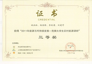 农业部科技发展中心、上海清洁能源研究与产业促进中心和壳牌(中国)有限公司联合开展的“2011年能源与可持续发展——壳牌大学生农村能源调研”活动评选中,环境学院2010级环境科学硕士姚涵淞及2010级环境工程硕士李松菊、刘建苛报送的调研案例被评为三等奖,获得了壳牌大学生能源调研项目评审委员会颁发的证书。