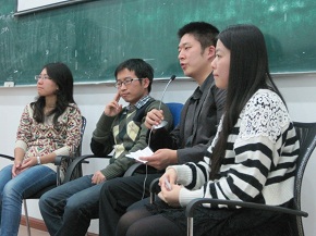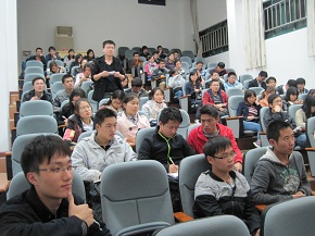 会上,王吟师姐首先发言。从研究生的整体规划、实验研究和论文发表三个方面做了详细的介绍。接下来黎明霞向新生们讲解了竞赛方面的流程及注意事项,推荐面对各种竞赛时“不妨一试”。在轻松有趣的有奖抢答环节过后,现于天华建筑设计有限公司担任所长助理的赵有亮和法国液化空气有限公司的工程师程炳宏则分别介绍了设计院和外企工作的有关问题,使新生们对研究生的学习方法与就业前景等都有了大致的了解。提问环节大家积极地与师兄师姐交流提问,师兄师姐也热心地对大家的问题一一解答。嘉宾们留了各自的微博、邮箱等联系方式以便以后的交流。此外,本次交流会后还设置了抽奖环节,为幸运观众分发了礼品,会场气氛融洽而活跃。
