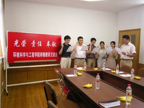 为了让环境学院新引进的年轻教师自觉学习老一辈教师崇高的人生追求、高尚的师德情操、无私的奉献精神,2006年9月8日,环境学院党委在明净楼308组织了以责任、奉献、光荣为主题的环境科学与工程学院师德建设交流会,即新教师宣誓仪式。
