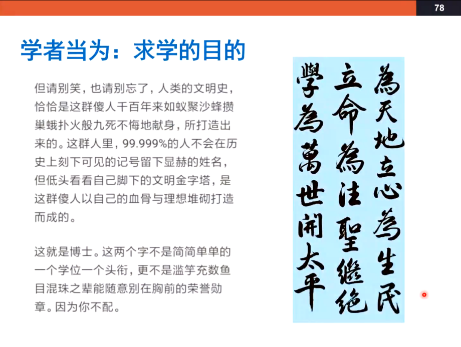 汇报最后,刘文老师用“为天地立心,为生民立命,为往圣继绝学,为万世开太平”总结了当代青年学者和大学生应有的求学态度。“学者”二字,不仅仅是一个称呼,它更多的是代表着一份责任,作为一名青年教师,我们需要具有这样的情怀——虽然对于人类文明金字塔我们或如蝼蚁,但正是无数的这样的人前仆后继才堆砌成了这座宏大的金字塔。