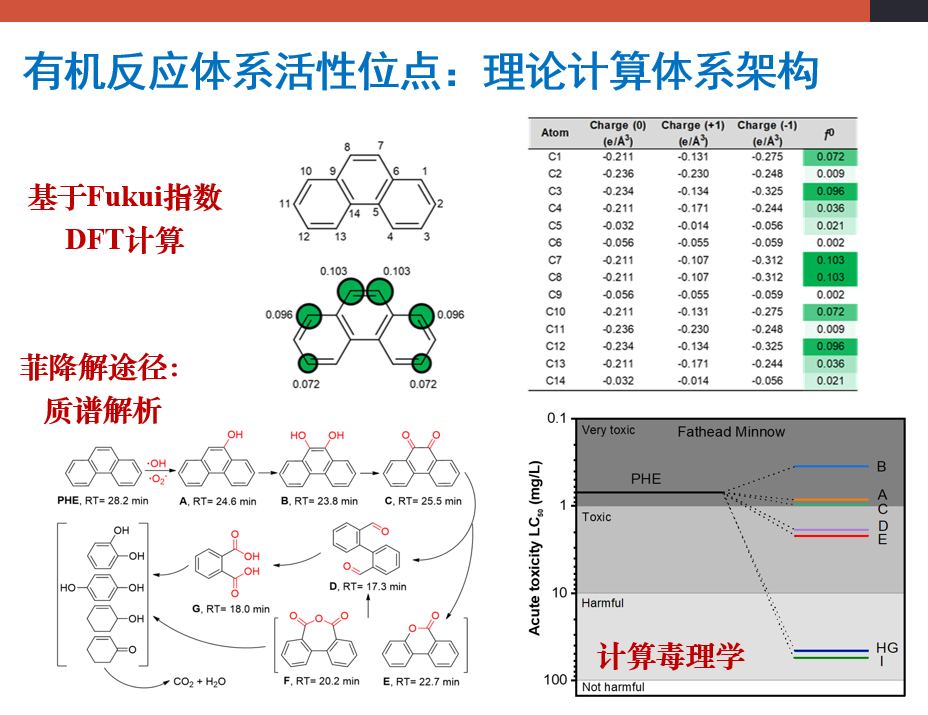 刘老师课题组主要进行环境功能材料全过程研究,包括前端环境材料的设计与合成、中端材料的环境应用和后端材料的环境行为与毒理。尤其是在钛酸盐功能材料环境应用和影响领域进行了体系化的研究。针对本期论坛的主题,即有机反应体系中活性位点的解析方面,刘文老师详细介绍了基于密度泛函理论(DFT)的有限尺度污染物分子活性位点计算的基本思想,且刘老师课题组现已形成了自由基攻击方式和有机污染物降解途径的模式计算方法,初步建成了拥有300种环境常见有机物分子的活性位点数据库(PKU-REOD)。这套理论计算方法得到了国内外学者的广泛关注,且为国内外同领域其他课题组无偿提供相关的理论计算服务。