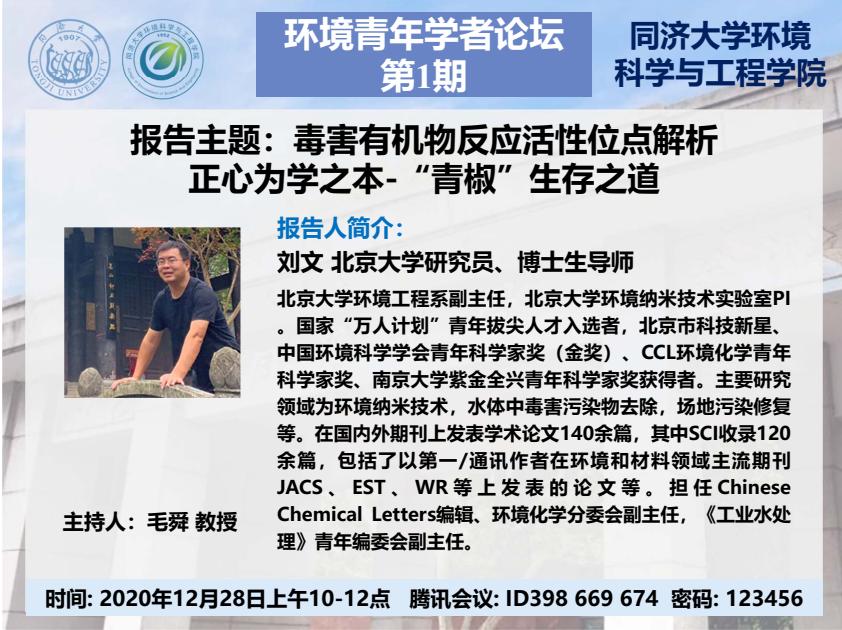 2020年12月28日,同济大学环境青年学者论坛举办了第一期活动,本期活动的报告人为北京大学刘文研究员,报告主题为“毒害有机物反应活性位点解析,正心为学之本-‘青椒’生存之道”。