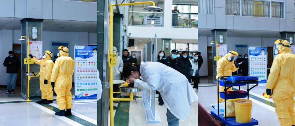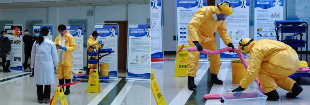 本次演练的第一场活动——化学品泄漏事故处置演练,学院邀请无锡赛弗文化产业有限公司翟永志讲师进行实验室安全培训及模拟演练。经过上午2小时的精心排练,学院7名师生和物业2名保安为大家生动演练了化学品泄漏后的学生应急喷淋、事故上报、现场隔离、穿戴防护、现场探测、泄漏处置、危废回收和结束洗消八大环节。