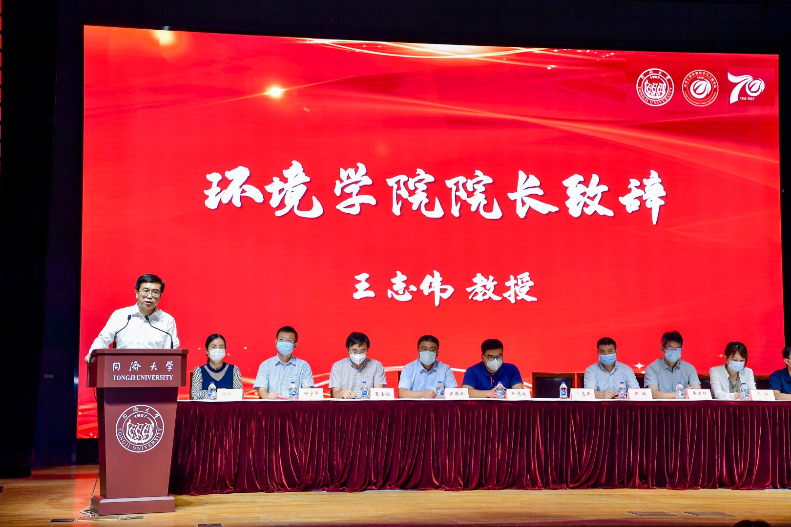 迎新大会结束后,党委书记徐斌教授为全体研究生新生作了“立德树人”专题报告。徐斌以“踔厉笃行七十载,不负青山向未来”为题,讲述了同济环境系科70年的发展脉络:从1952年的学科初创到今天迈入发展新时期,环境系科的70年,是与祖国环保事业共同发展的70年,是与祖国环境学科携手并进的70年,是与祖国环境科教砥砺前行的70年。七十年来,同济环境人前赴后继,不断深研课程教材编写、丰富教学科研平台、持续扩大对外交流,始终活跃在国家重大科技创新和前沿技术攻关的舞台。他希望新生们怀着对同济环境人的自豪感和使命感,接过前辈的重托,奋勇前进再创辉煌,将论文写在祖国大地上。