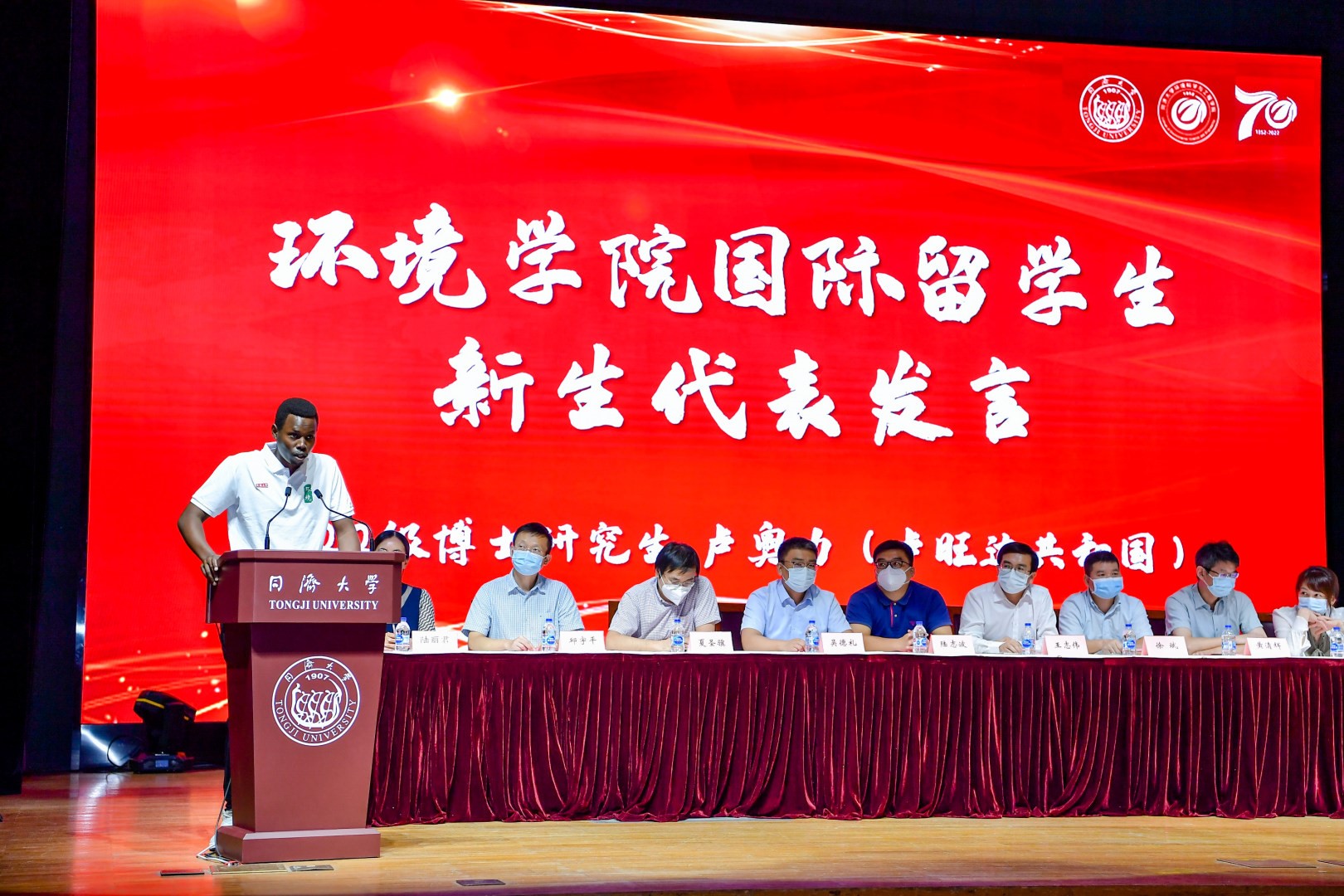 接下来,老生代表2021级硕士研究生、学院研究生会主席徐则林同学、2022级研究生年级辅导员许君清老师、新生代表2022级博士研究生邓贝奇同学、国际留学生新生代表2022级博士研究生卢奥力同学依次进行发言。徐则林同学通过三个关键词“多彩”、“良师”和“协作”总结了进入同济一年以来的真情实感,与新生们共勉,并送上了自己的诚挚祝福。许君清老师向大家揭秘了2022级新生大数据,让大家对环境新生的情况有了基本了解,勉励新生在新时代同济文化的浸润中书写属于自己的人生华章。邓贝奇同学代表全体新生道出了对研究生生涯的向往与期待,并许下了“上下而求索,严谨求知”的诺言。来自卢旺达共和国的卢奥力同学讲述了自己对中国文化的热爱,希望通过在中国求学的收获为祖国的社会经济发展作出贡献。
