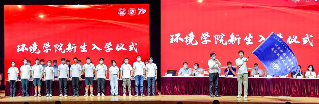 之后,举行了新生班主任的受聘仪式。在紧接着的入学仪式中,学院领导为2022级研究生新生代表佩戴校徽,王志伟为新生授环境学院院旗,飘扬的院旗象征着环境学院精神的传承。