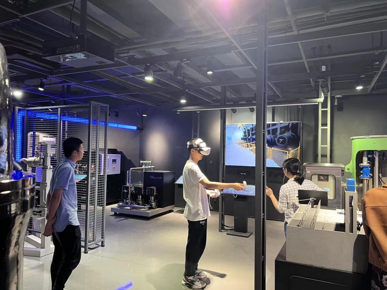在产品展厅,设置了格兰富多款先进的水泵模型和VR体验设备,同学们在学习了解各种水泵的运行原理和操作方法的同时,也可以进行实际操作体验和VR体验。