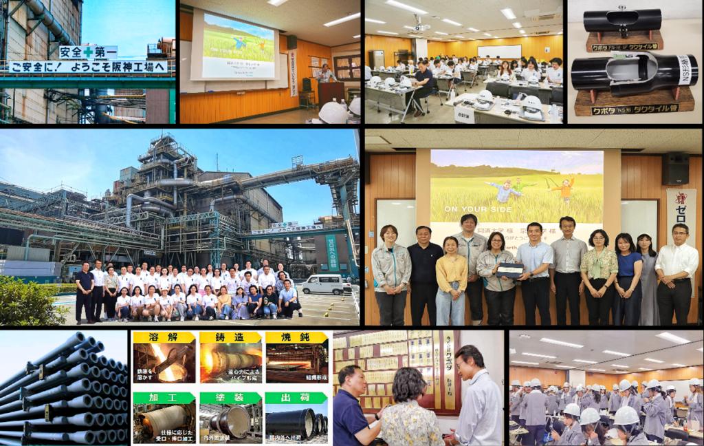 第二天我院师生来到了兵库县尼崎市,在久保田有限公司阪神工厂进行相关交流学习。全体成员先来到会议室听取工厂负责人介绍久保田公司的概况,同学们了解到久保田集团致力在粮食、水、环境领域解决社会课题,已有百余年历史,主要产品有工程机械、农业机械、球墨铸铁管、钢管及各类环保设备、民用阀门等。本次参观的阪神工厂主要是生产抗震性球墨铸铁管,包括直管、异型管和GX异型管等,在日本和世界各地饮用水和污水的安全运输和抗震中发挥了重要作用。